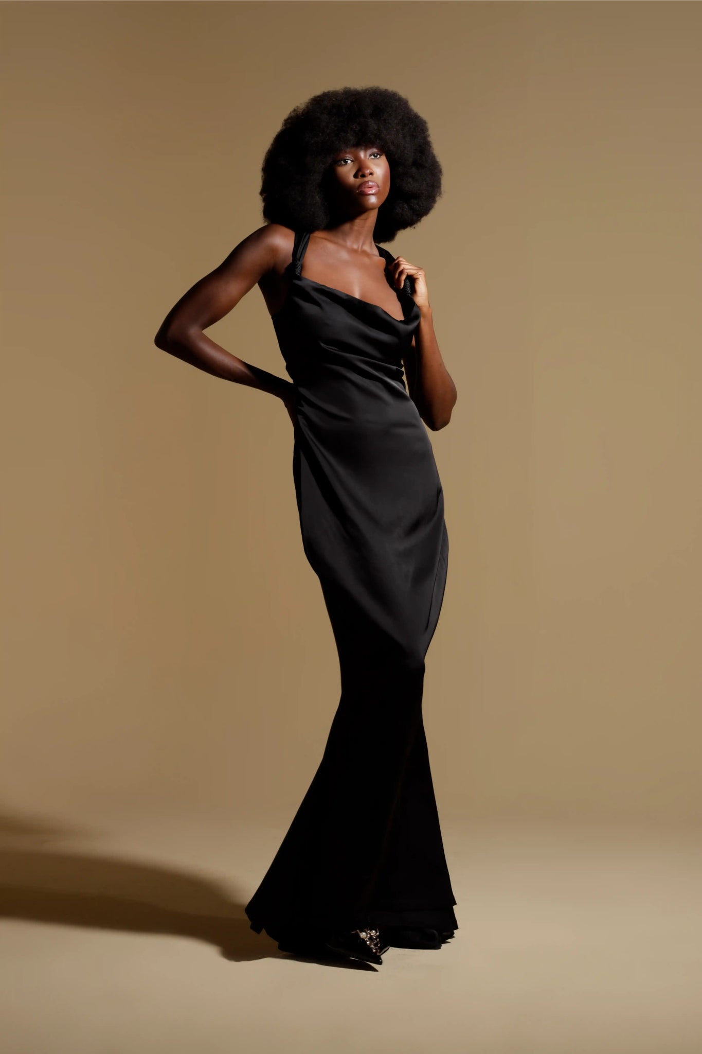 An embodiment of luminous, unapologetic femininity, the TIZIANA is a masterpiece of sculptural design. Crafted from a molten charmeuse that pools around the form like liquid light, its silhouette is a breathtaking study in tension and artistry.