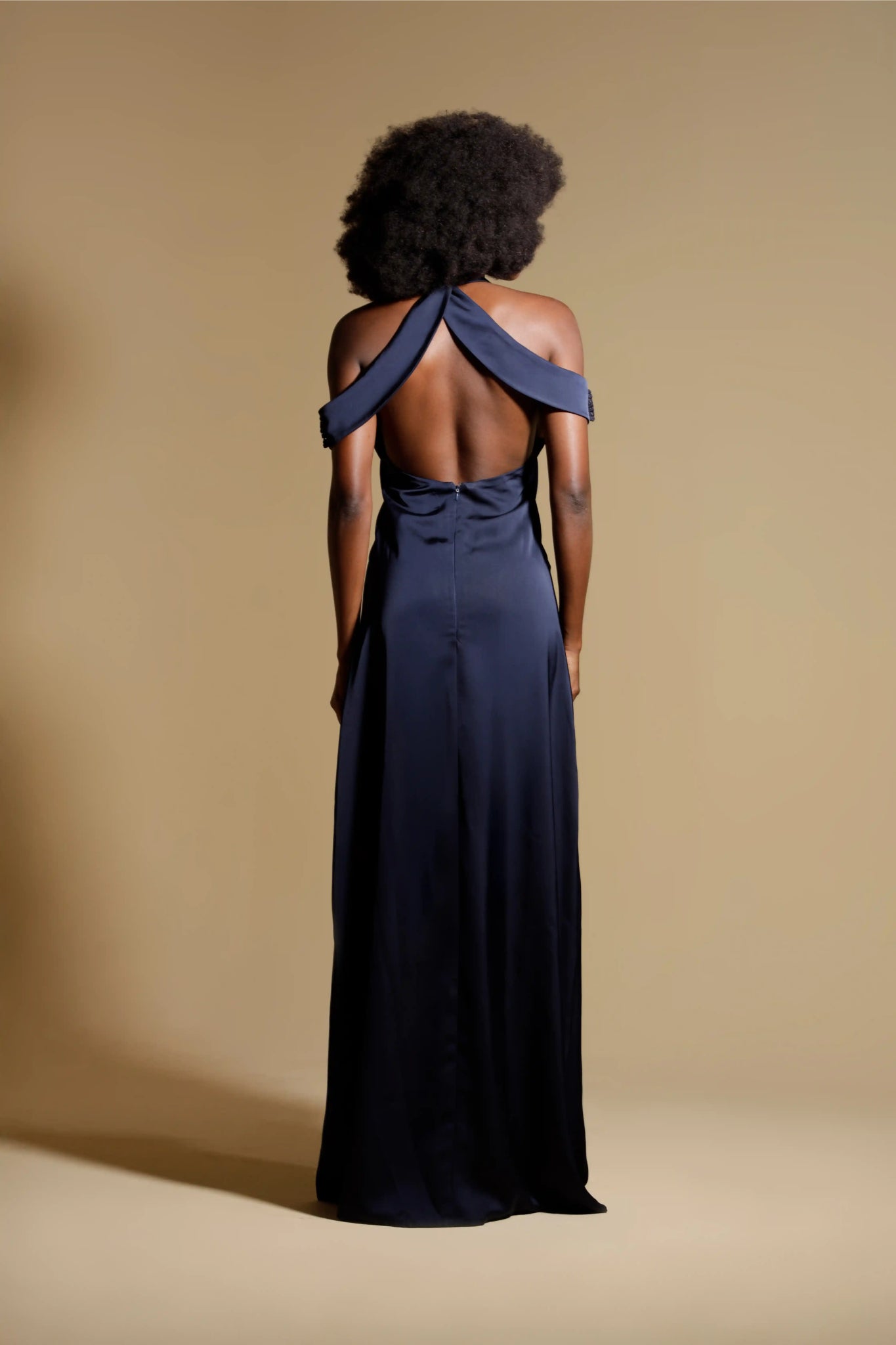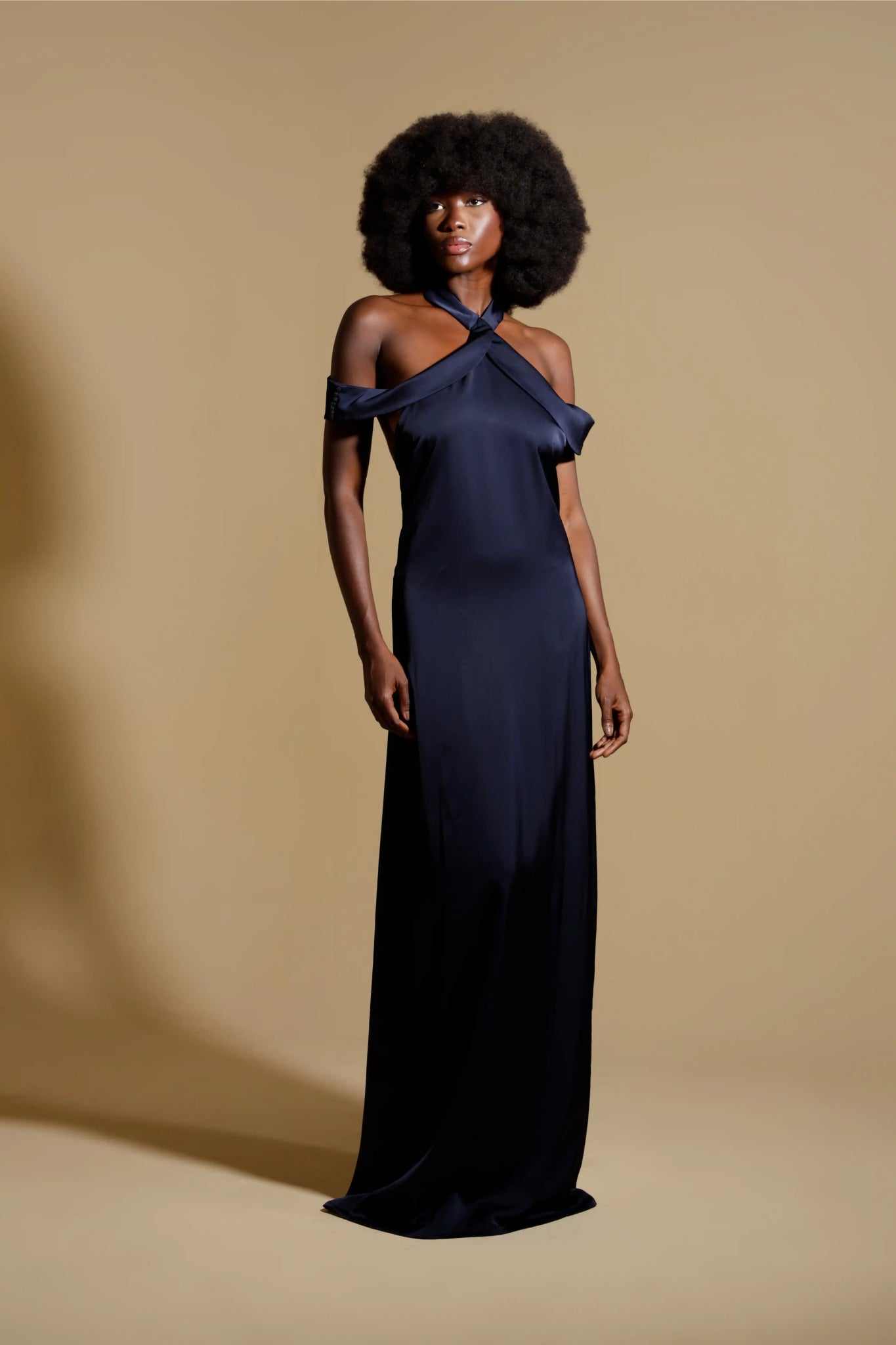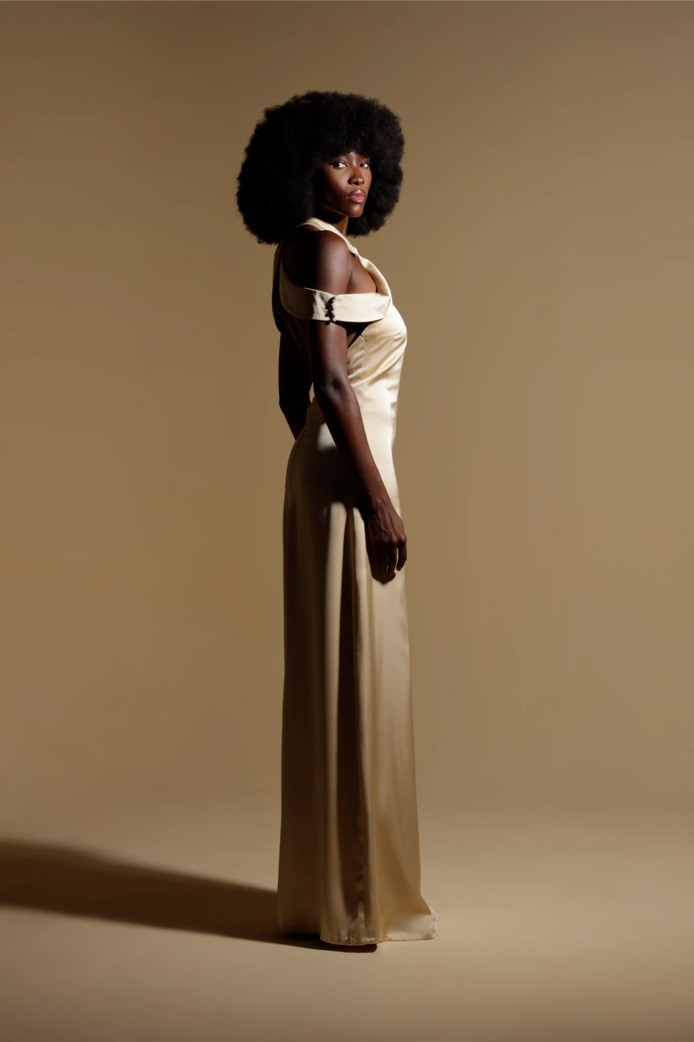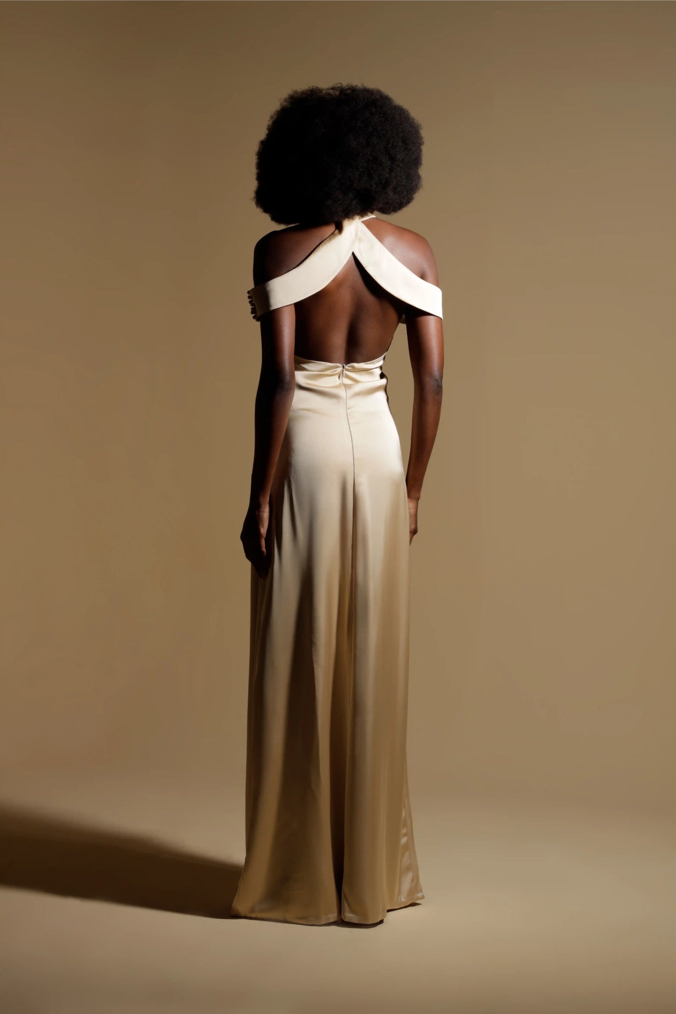 An exquisite study in sculptural grace, the FIORELLA Gown is a testament to the art of the unexpected. This piece unfolds not like a garment, but like a blossom. Its design originates from a masterful deconstruction of a classic neckline: a twisted halter that cascades asymmetrically into a singular, off-the-shoulder drape, subtly traced with a line of delicate crystals.