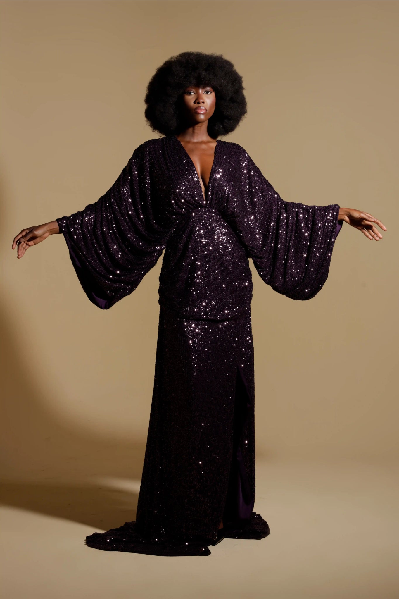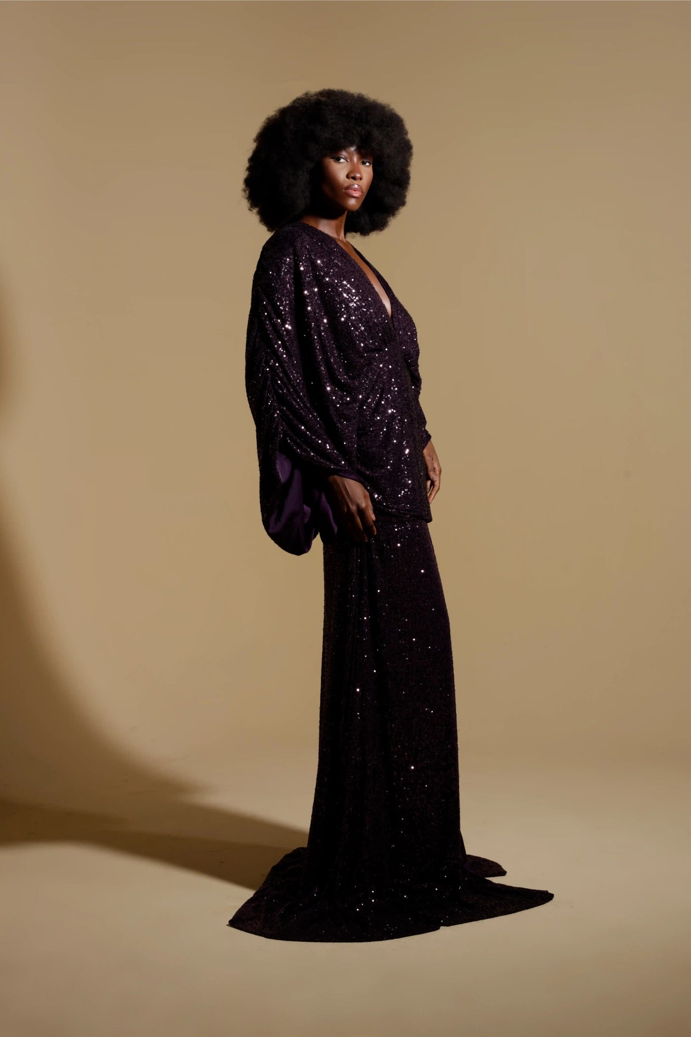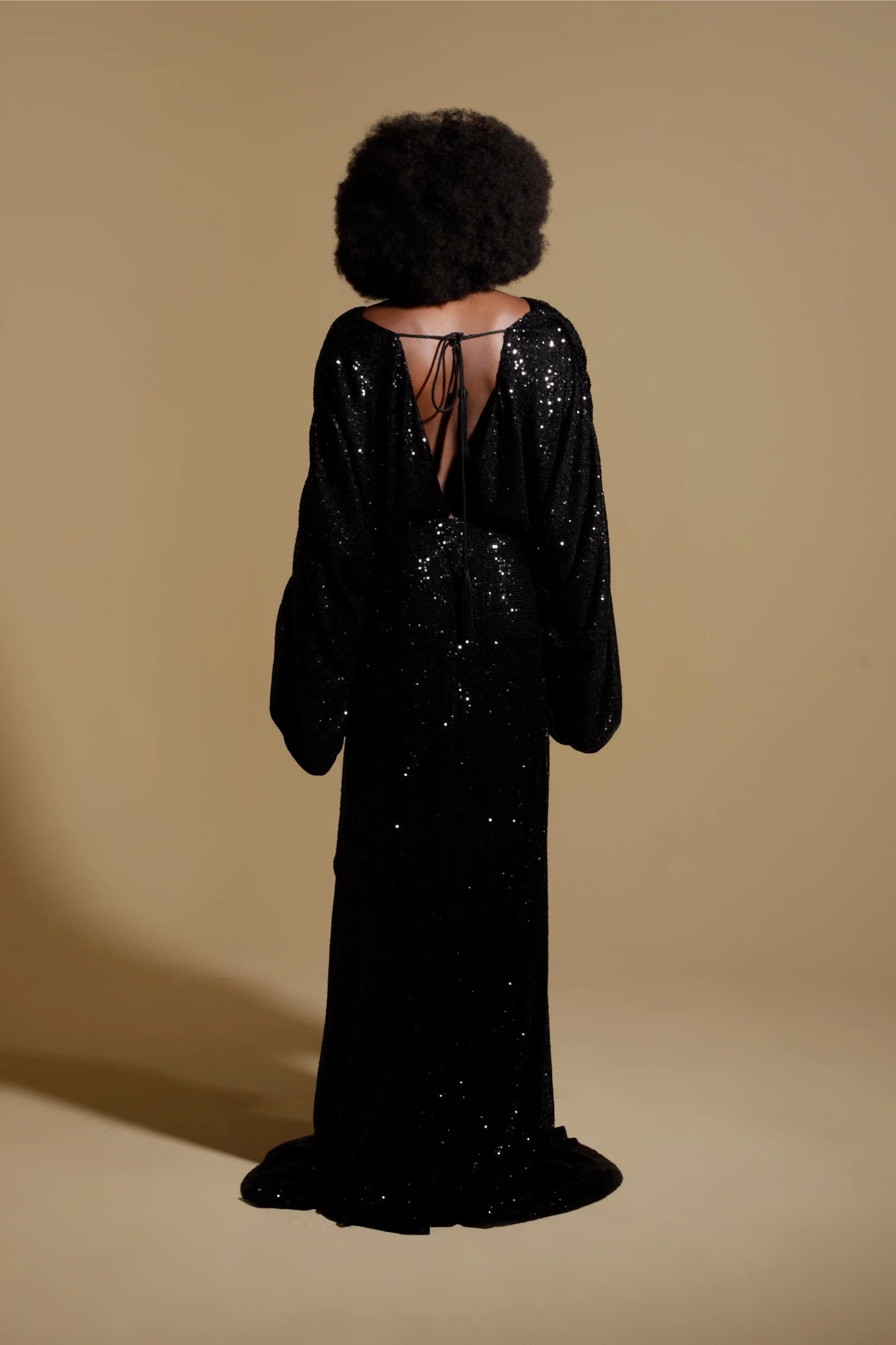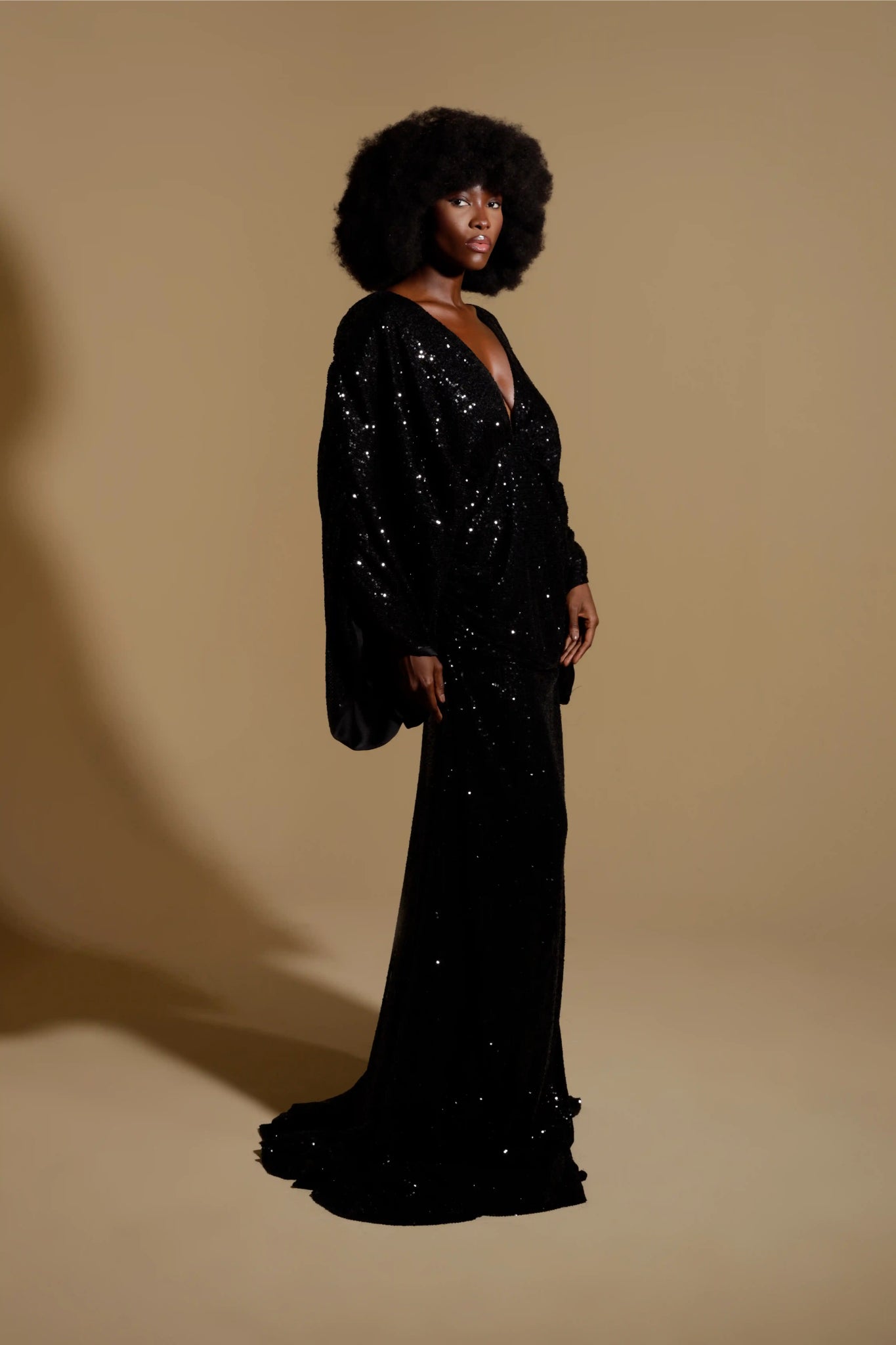 Meticulously hand-finished, the gown unfolds in a breathtaking expanse of high-lustre sequins, each precisely placed to ignite a constellation of brilliance with every movement. The silhouette, a harmonious paradox of fluid grace and sculptural definition, features dramatically voluminous dolman sleeves that whisper tales of bygone glamour, while a provocatively deep V-neckline plunges with an exquisite confidence.