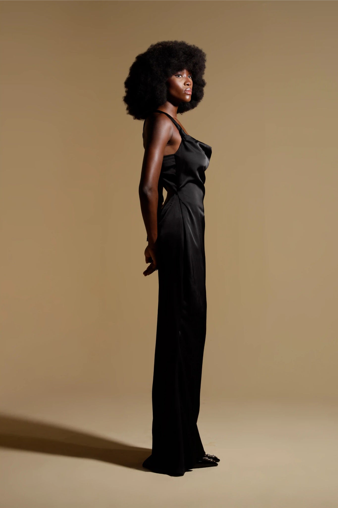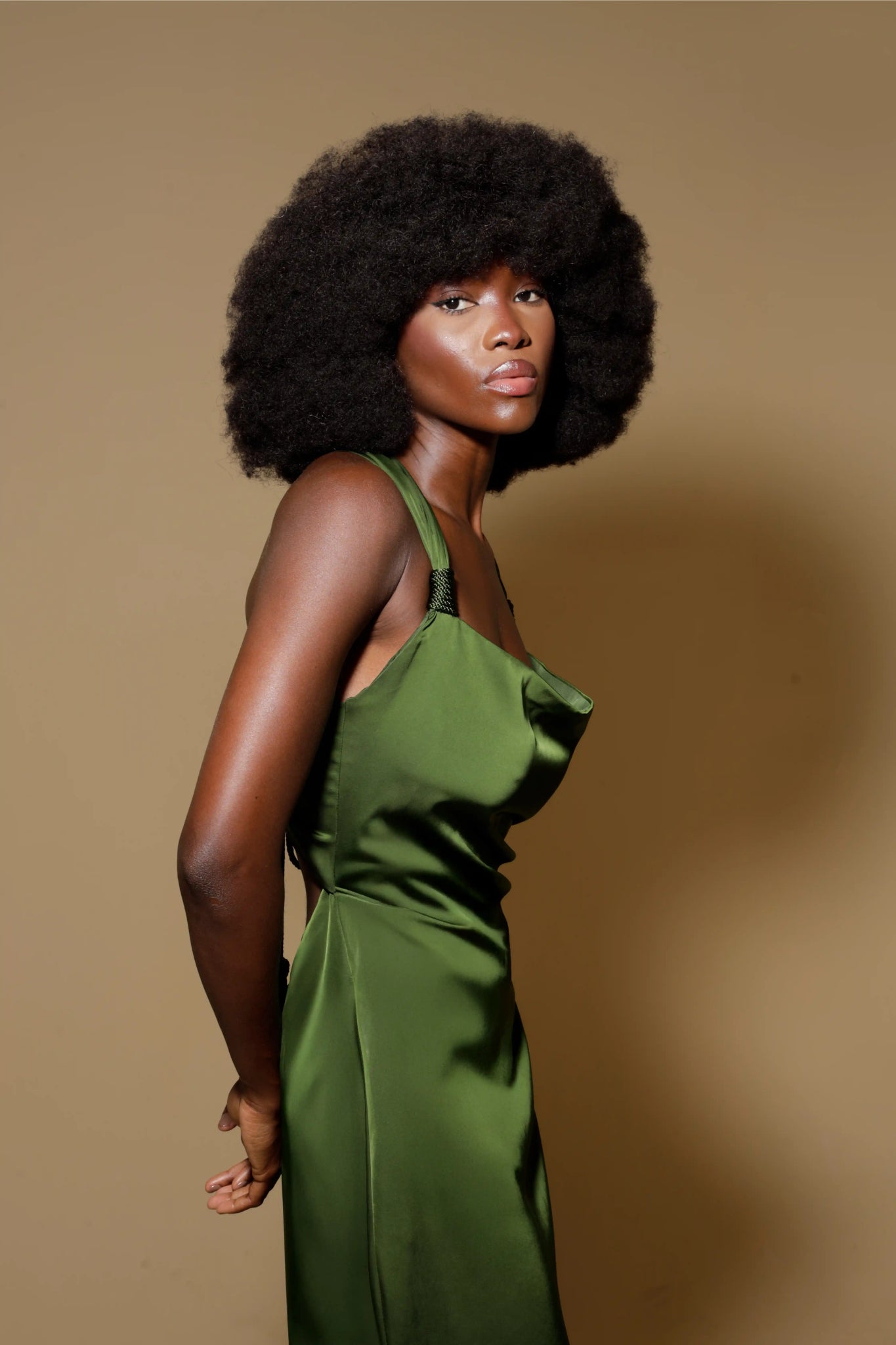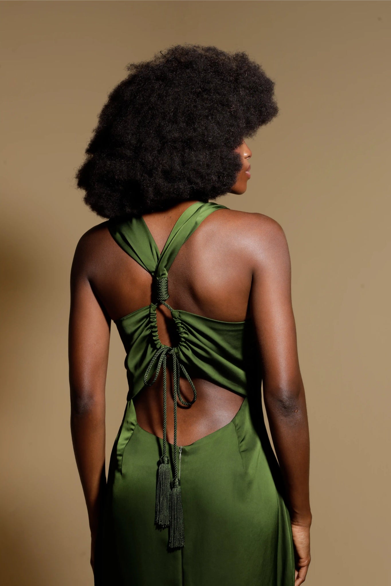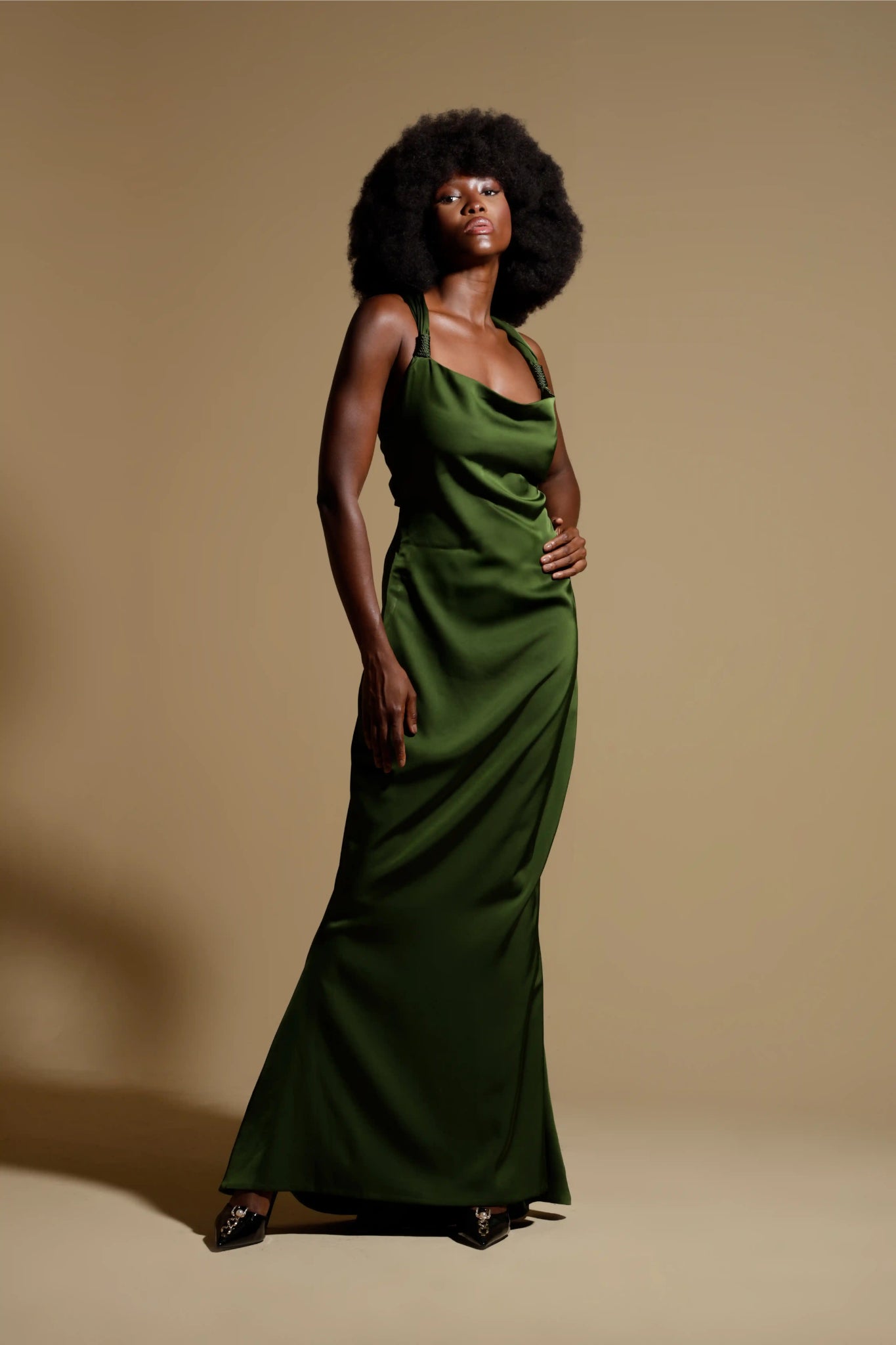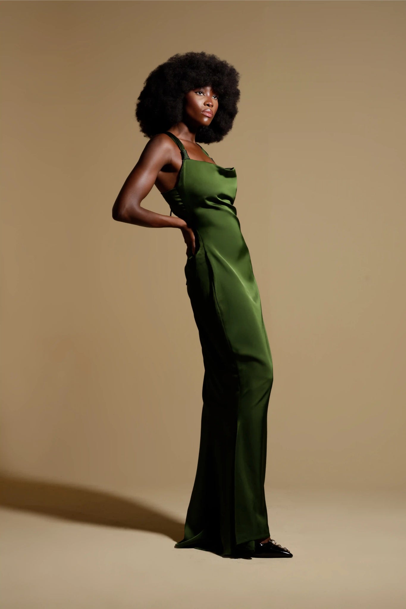 A tribute to the 'little queen' within, the REGINETTA Gown is an exercise in sublime elegance. From the front, its lustrous, liquid satin pours over the silhouette in a single, uninterrupted line, beginning with a gracefully draped cowl neckline that whispers of classic Grecian artistry. The gown skims the body, its verdant hue rich with the promise of timeless style.
