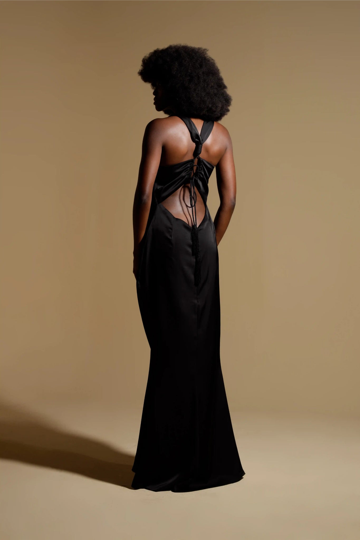 Yet, its true poetry is revealed in a breathtaking turn. The back unfolds as a masterwork of intricate craftsmanship—a delicate interplay of hand-twisted straps and precise gathering, secured by a dramatic, hand-knotted tasseled tie. This is the heart of the ORIGEN collection: a conscious design that balances sensual revelation with refined artistry, creating a piece that feels both powerful and profoundly feminine.
