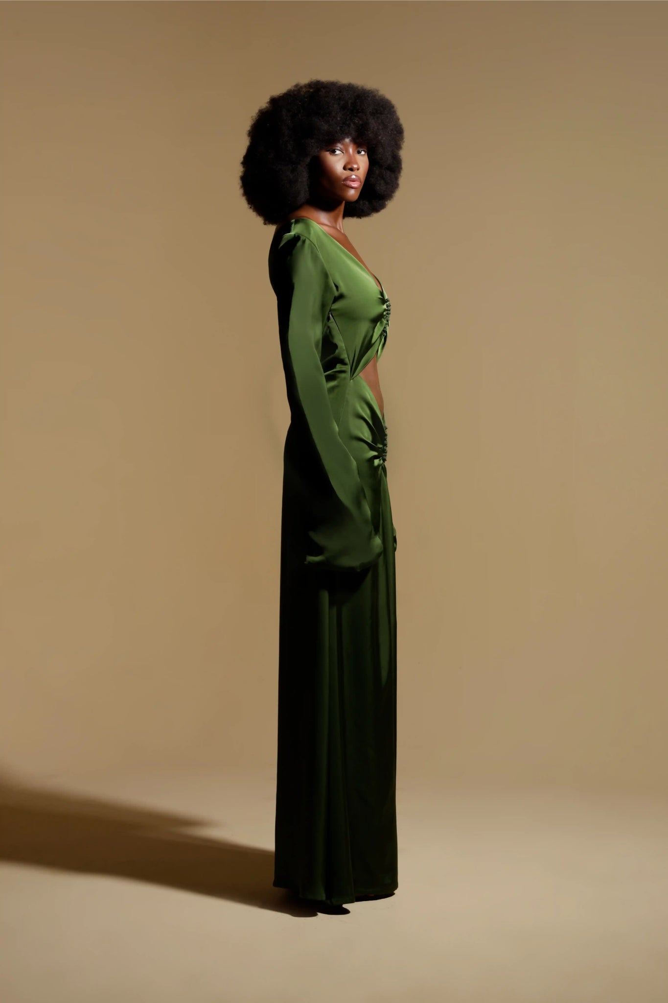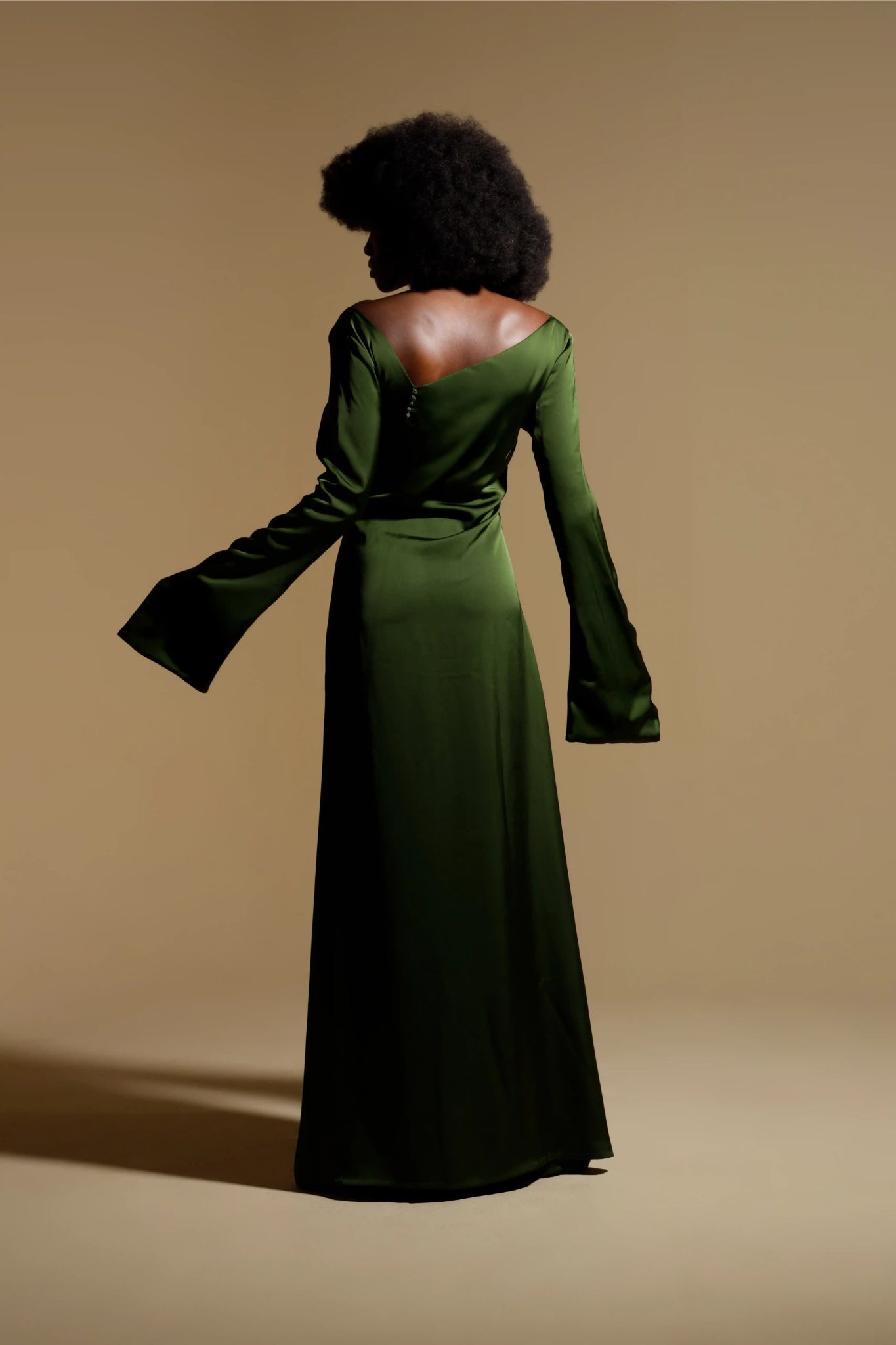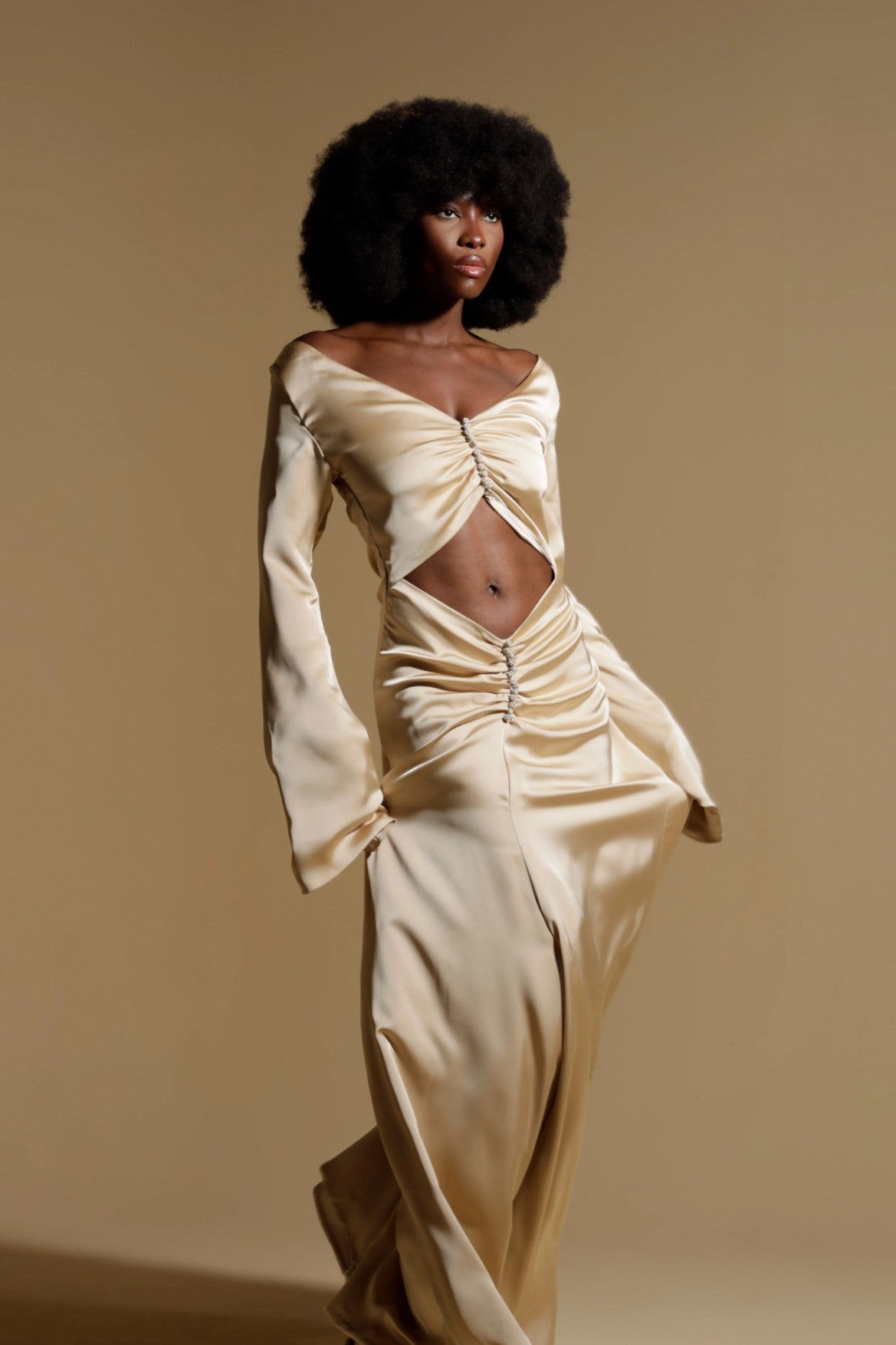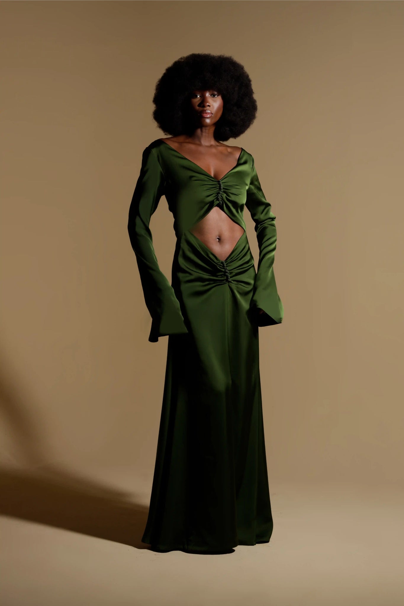 Masterful ruching converges at the torso, secured by two constellations of hand-set crystals that anchor the silhouette and draw the eye. This intricate gathering creates a daring diamond aperture—a sensual yet exquisitely controlled reveal that celebrates the form. Framed by a sweeping portrait neckline and graceful fluted sleeves, the TIZIANA is the essence of the ORIGEN collection: a wearable work of art, born from a legacy of meticulous, emotion-led craftsmanship.