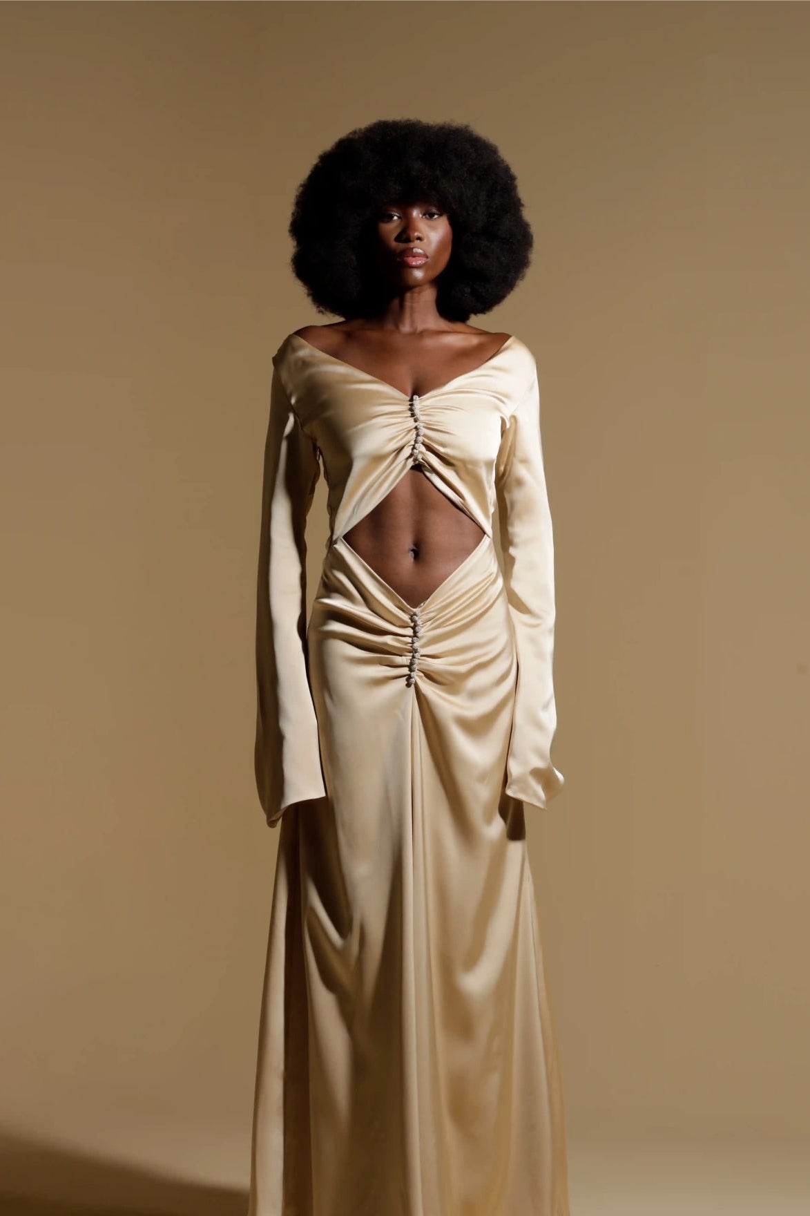 * Artisanal Ruching: Expertly gathered fabric creates a flattering, sculptural texture that defines the waist and bust.