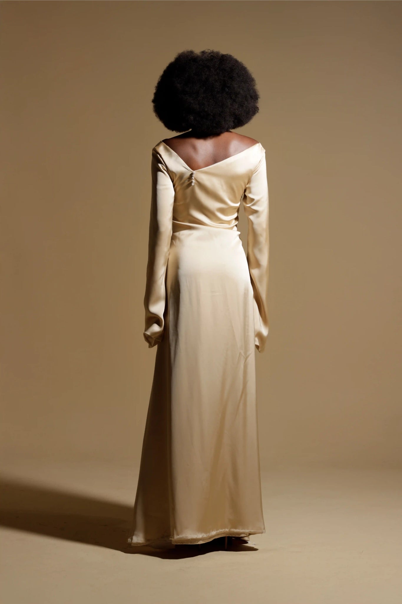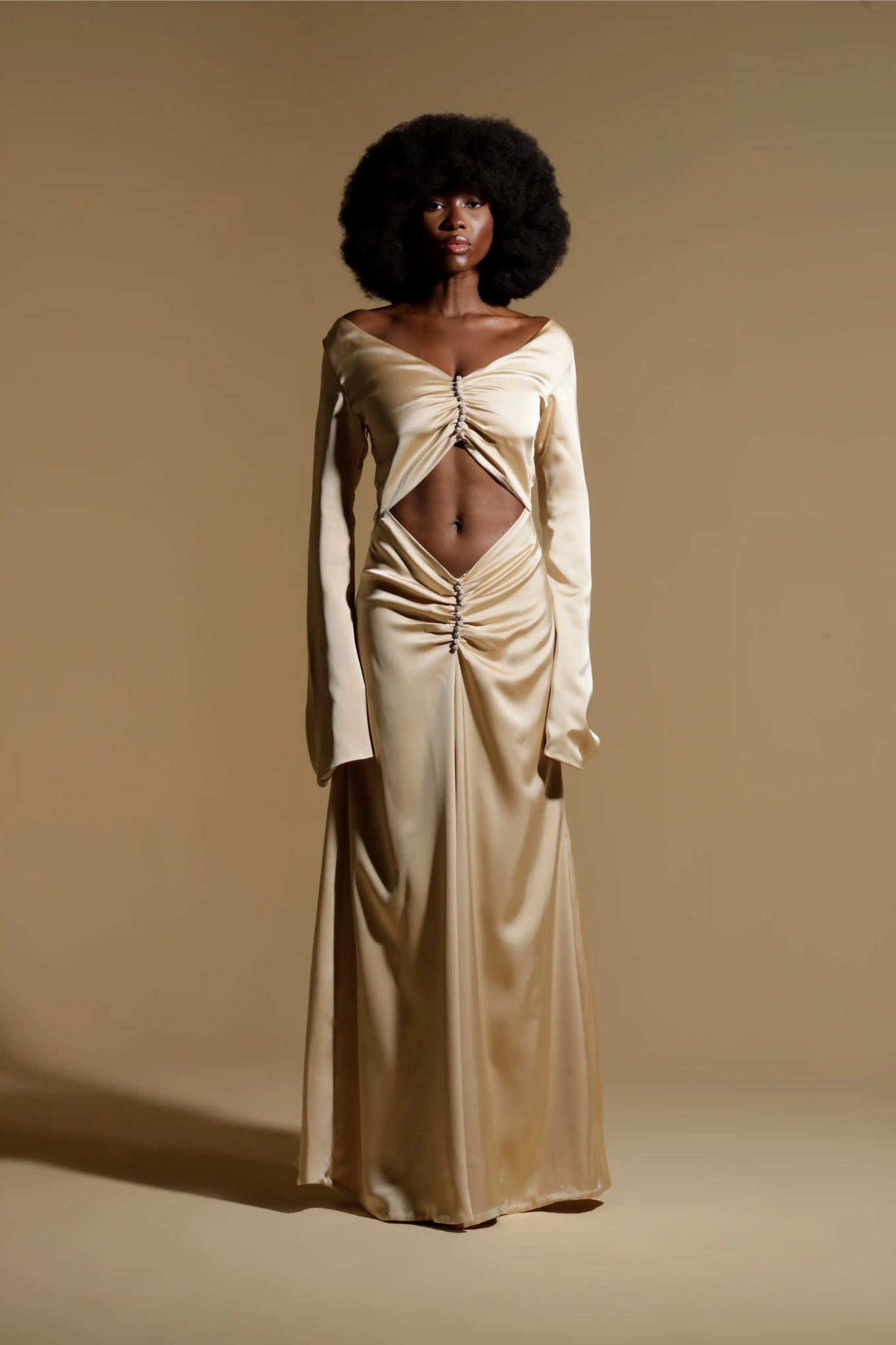 An embodiment of luminous, unapologetic femininity, the TIZIANA Gown is a masterpiece of sculptural design. Crafted from a molten charmeuse that pools around the form like liquid light, its silhouette is a breathtaking study in tension and artistry.